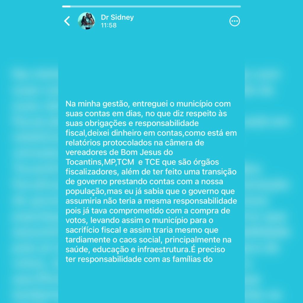 O ex-prefeito de Bom Jesus do Tocantins, Dr. Sidney Moreira (PT), usou as redes sociais para rebater declarações recentes do atual prefeito Jeilson Reis (MDB), feitas durante a participação do gestor em um podcast da região. Segundo o ex-prefeito, as falas distorcem fatos administrativos e tentam transferir responsabilidades pelos problemas enfrentados atualmente pelo município.