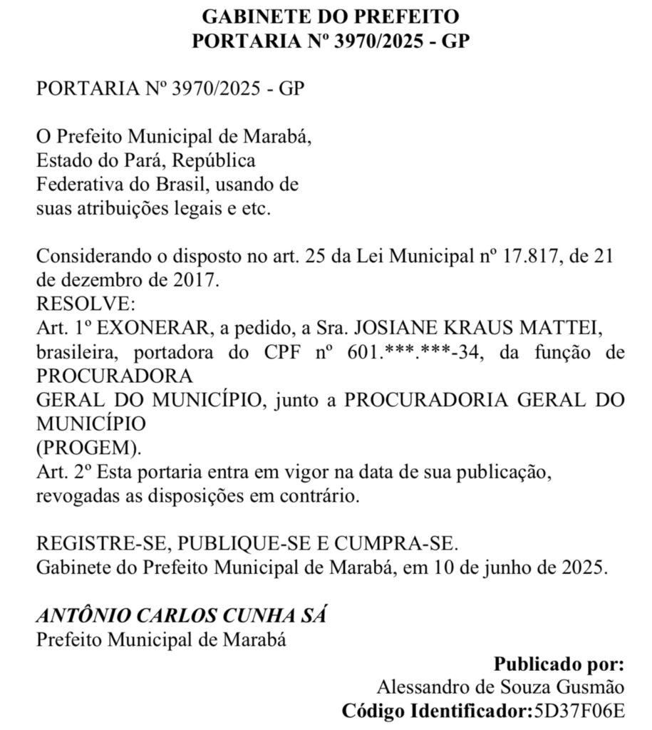 A instabilidade política na Prefeitura de Marabá teve um novo desdobramento nesta semana. No mesmo dia em que a Câmara Municipal aprovou a abertura do processo de impeachment contra o prefeito Toni Cunha (PL), a procuradora-geral do município, Josiane Kraus Mattei, pediu exoneração do cargo. Ela é a primeira integrante do alto escalão a deixar a gestão desde o início do atual mandato.