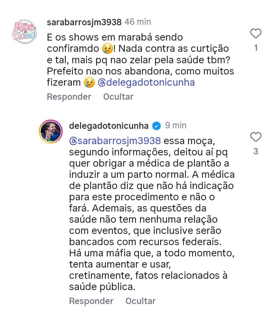Ao ser cobrado nos comentários, o prefeito reagiu de forma que gerou ainda mais críticas. Em vez de demonstrar solidariedade com a mulher, Toni Cunha insinuou que a gestante teria permanecido deitada no hospital para “obrigar a médica de plantão a induzir um parto normal”, afirmando ainda que não havia indicação para o procedimento.