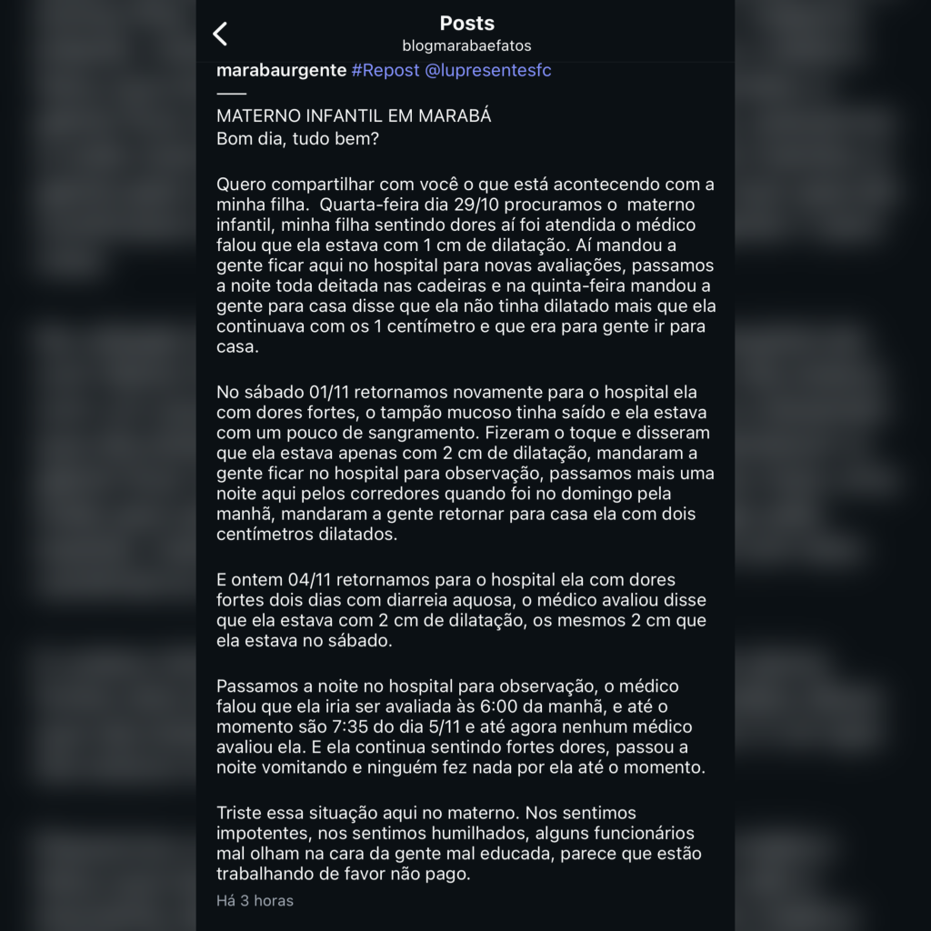 Uma denúncia feita por uma moradora de Marabá sobre o atendimento no Hospital Materno-Infantil voltou a expor a fragilidade da saúde pública no município e provocou forte repercussão nas redes sociais. Em seu relato, a mulher descreveu uma sequência de idas e vindas à unidade de saúde desde o dia 29 de outubro, acompanhando a filha em trabalho de parto, mas sem receber o atendimento adequado.