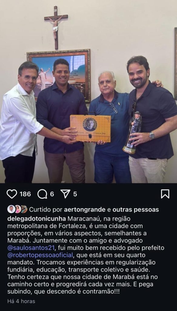 “Maracanaú, na região metropolitana de Fortaleza, é uma cidade com proporções, em vários aspectos, semelhantes a Marabá. Juntamente com o amigo e advogado @saulosantos21, fui muito bem recebido pelo prefeito @robertopessoaoficial, que está em seu quarto mandato. Trocamos experiências em regularização fundiária, educação, transporte coletivo e saúde. Tenho certeza que nossa cidade de Marabá está no caminho certo e progredirá cada vez mais. E pega subindo, que descendo é contramão!!!”