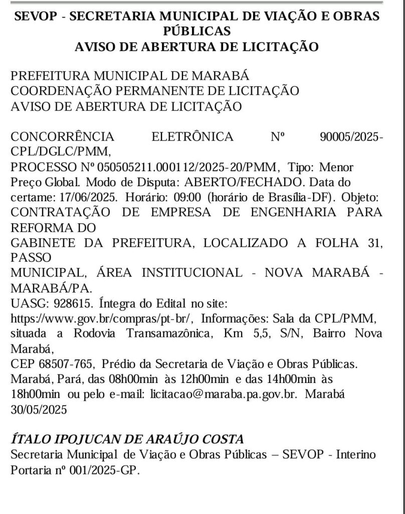 Enquanto pacientes seguem sendo atendidos no chão por falta de leitos e macas no Hospital Municipal de Marabá, a Prefeitura abriu uma nova licitação — desta vez, para reformar e decorar o gabinete do prefeito Toni Cunha. O aviso oficial foi publicado no último dia 30 de maio pela Secretaria Municipal de Viação e Obras Públicas (Sevop), e estabelece a contratação de uma empresa de engenharia para executar a reforma do espaço localizado no Paço Municipal, na Nova Marabá.