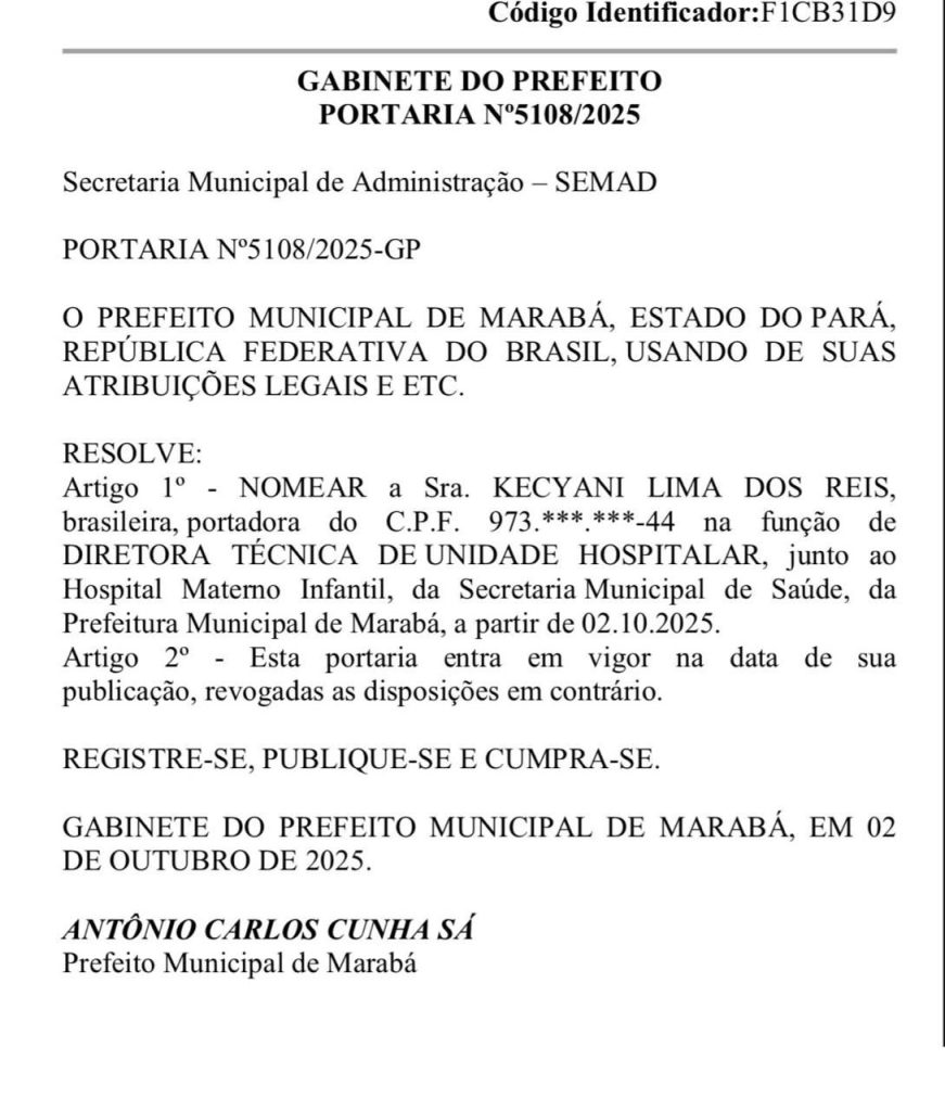 A nomeação de Kecyani Lima dos Reis como Diretora Técnica do Hospital Materno Infantil de Marabá (HMI), publicada em 2 de outubro de 2025, gerou preocupação entre servidores, especialistas e conselhos de saúde. Segundo normas do Conselho Federal de Medicina (CFM), a direção técnica de maternidades deve ser exercida por médico especialista em Ginecologia e Obstetrícia, com registro do título (RQE) e experiência em gestão hospitalar — requisitos que Kecyani não atende.